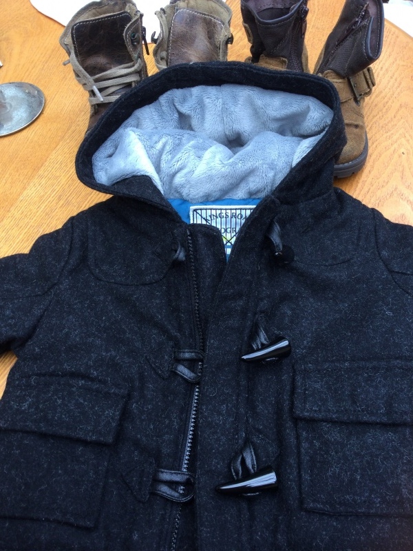 Lovely warm black Duffy coat 3/6 months with hood vgc
