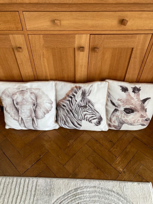 Settee cushions beige with animal heads, elephant zebra giraffe. Price for 3.