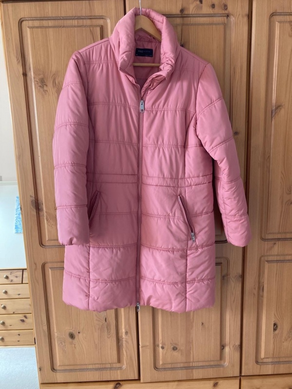 Coat, Pink, puffa, long size 16. 2 way zip.