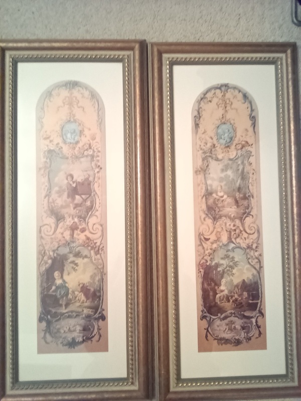 Like new pictures with a lovely soft green burnished gold frame.Pictures have slightly different scenes. Size 66cmx28cm