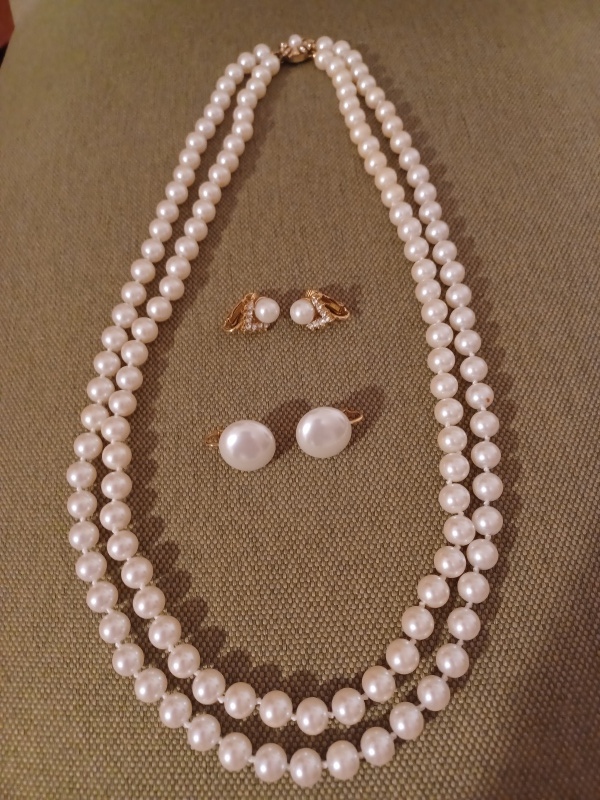 Faux pearl knotted double strand necklace.Lovely sized pearls good condition. Including 2 pairs clip earrings. WhatsApp message me.