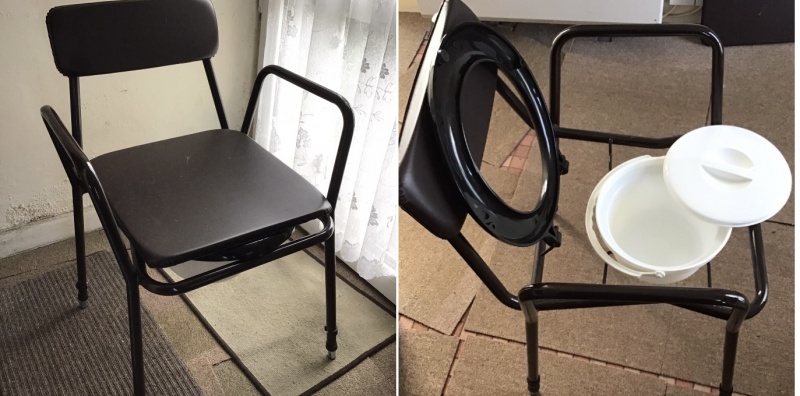 Lightweight commode with potty & lid. Seat cover a bit worn, but all clean & functional. £5