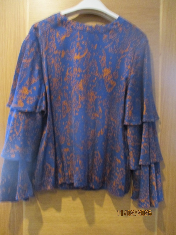 Blue/rust gold blouse, size 12 floating sleeves, new