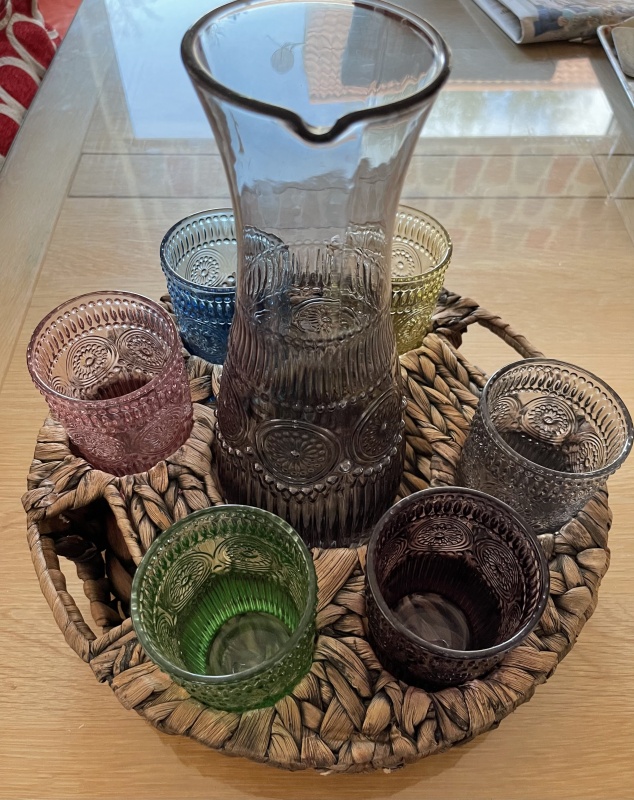 Large jug with six glasses, assorted colours within an easy to carry tray. Glasses hand wash only.