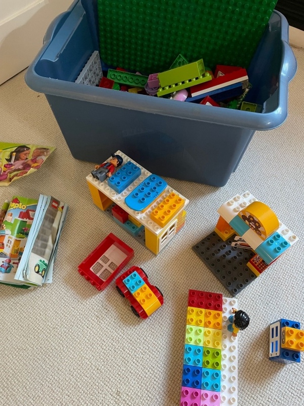 Large box of Duplo and green base. Excellent condition, (Worn) instructions to make garage and cake set.