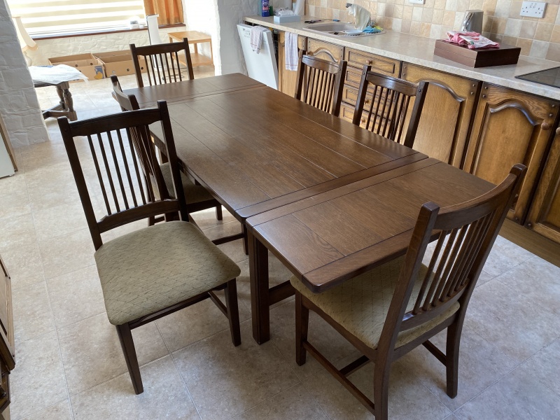 Oak dining table and 6 chairs. 900x2140 open. 900x1340 closed. Excellent condition