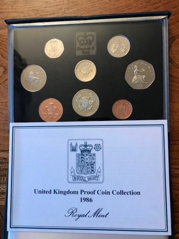Give cased proof set 1986 coinage, penny to two pounds (8 coins).