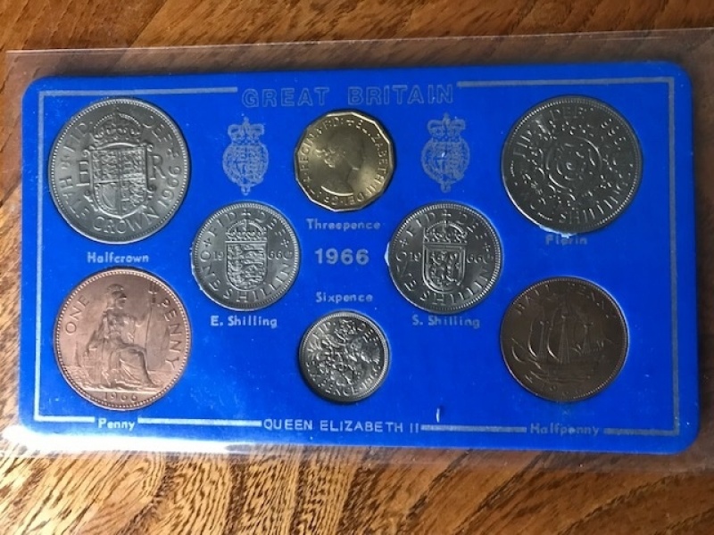 Give cased set 1966 coinage, halfpenny to half crown (8 coins).