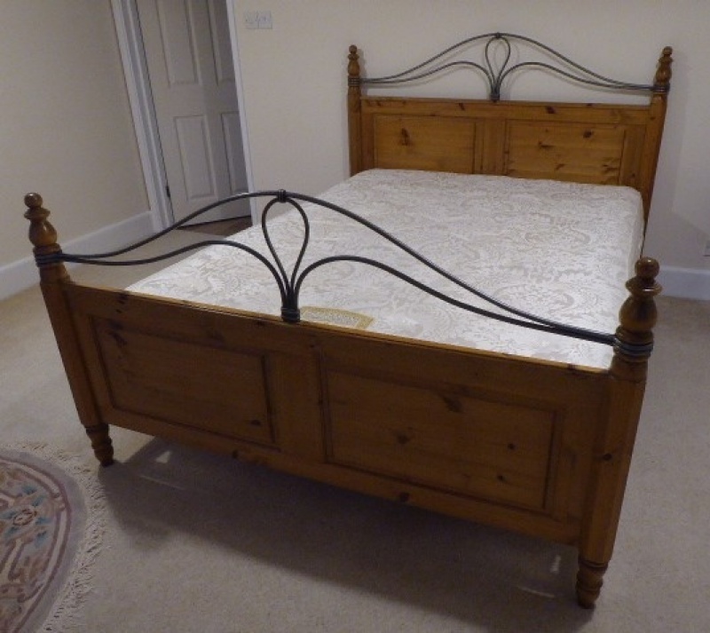 Sturdy king sized pine bed with Vi-spring mattress and wood slatted base. VGC. Can be dismantled for transportation