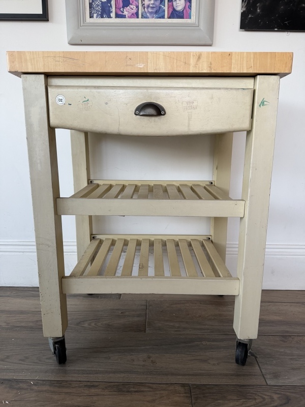 Butcher's block on wheels. Solid wood chopping block.