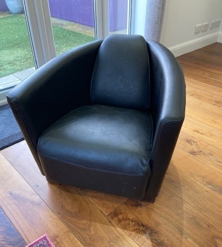 Dark leather tub chair. Good condition.