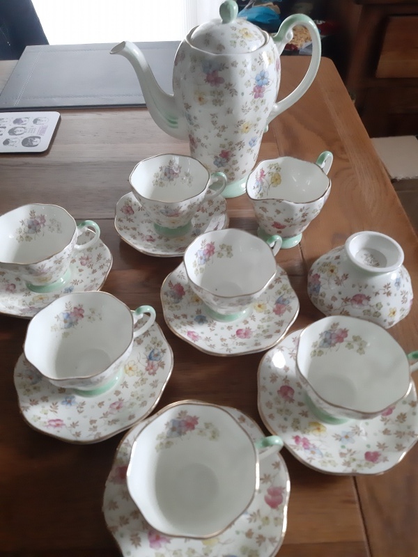 Pretty fine china pale green, coffee set, espresso size cups. No chips, or damage, perfect collectable order.