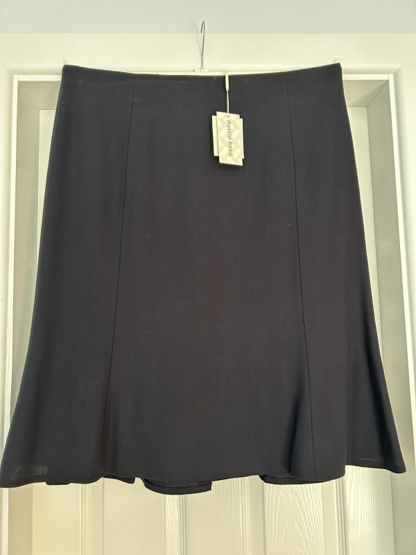 A-line with 3 gores. Rear zip with internal plastic button. Lined. Waist: 39”. Hip: 45”. Length: 26.5”.