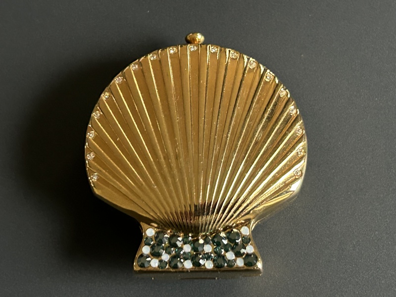 Excellent unused condition. Goldtone metal case with green/white crystals. Contains powder with applicator. Dimensions: 5.5cm diameter x 1.5cm.
