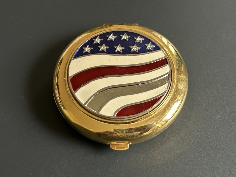 Good condition, but missing one red enamel stripe/crystal. Unused powder with applicator. Dimensions: 6.2cm diameter x 1.5cm.