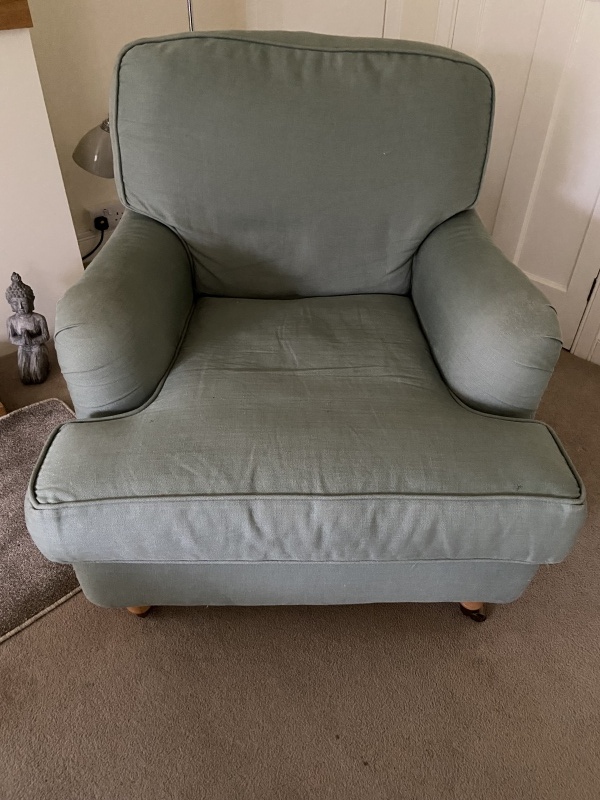 Old but still comfortable large 'Sofa.com' armchair. Colour duck egg. W84 x D94 x H90 cms.
