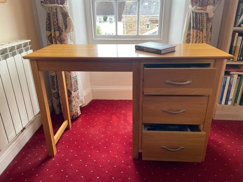Solid oak office/writing/PC desk. x3 drawers. Ideal for students. 118cm wide x43cm deep, 77cm high