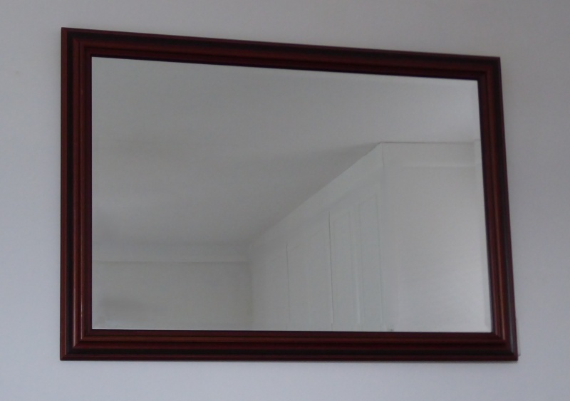 Dark wood frame,. Bevelled glass. 40" x 28". Substantial fittings for vertical or horixontal hanging. Very good condition.
