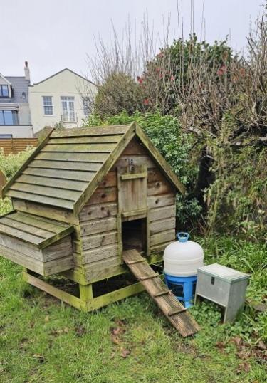 Chicken Coop, autofeeder, water tank, wire mesh, straw, no chickens