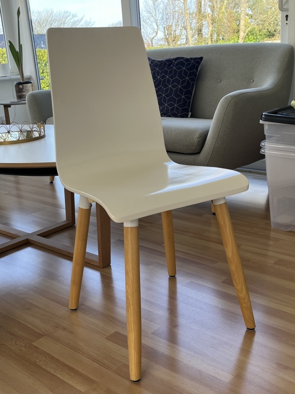 6 x John Lewis white wooden dining chairs. Light oak legs. Excellent condition.