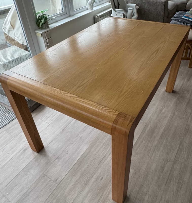 Sold oak table, with very few imperfections. Rounded ends. 150 x 90