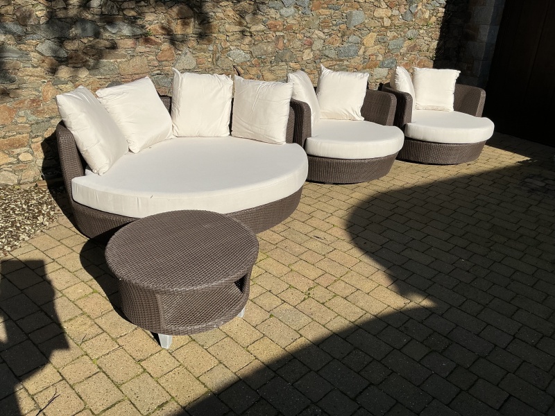 Set of garden furniture with cream cushions. Collection only