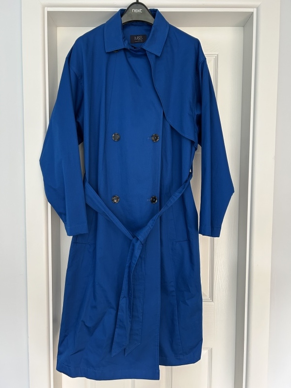 Buttons, pockets, rear vent and tie belt. Lined. Machine washable. Bust: 50”. Waist: 50”. Hip: 50”. Length: 47”.