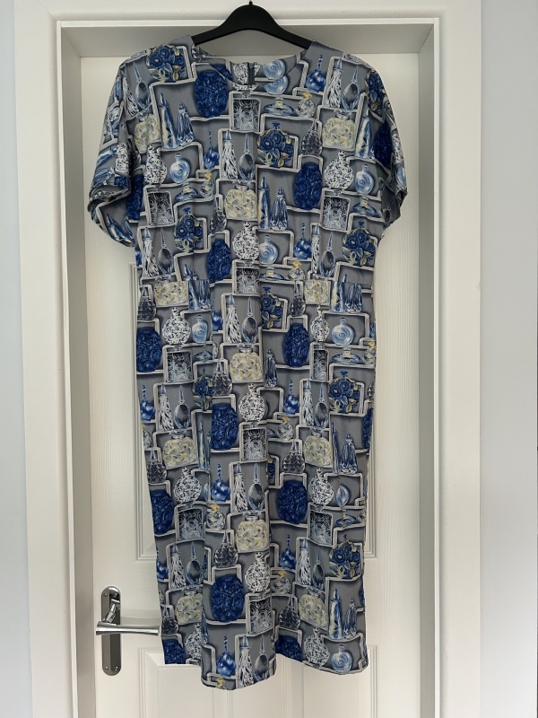 Woodrow Studio cotton fabric. Short sleeves, round neck, rear zip and vent. Bust: 44”. Waist: 38”. Hip: 43".