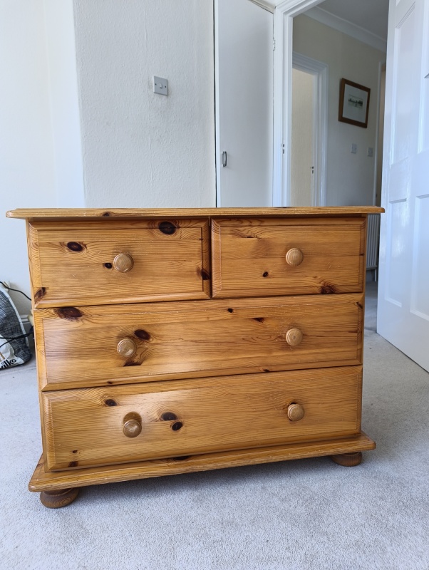 Pine 2 large drawers 2 small H65cmW81cmD41cm bun feet normal age marks
