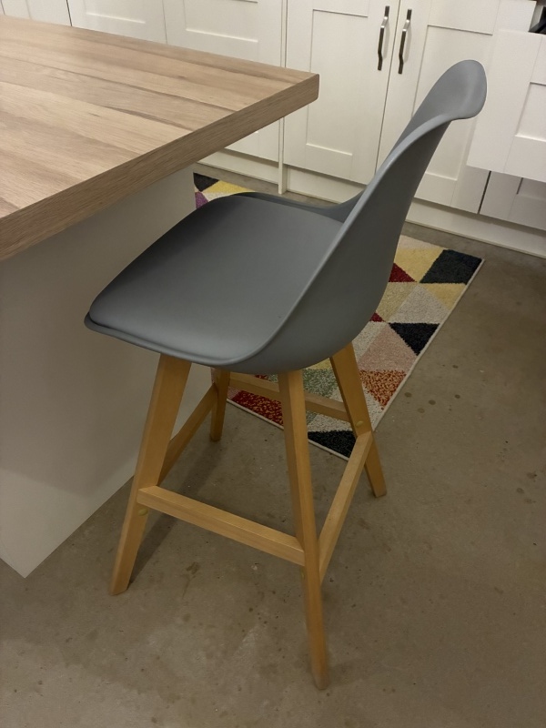 2 Grey wipe clean bar stools with light wood frames. Original BandQ. Used but like new.
