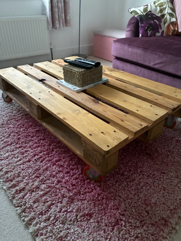 Pallet coffee table on wheels, easy move around, would suit larger room