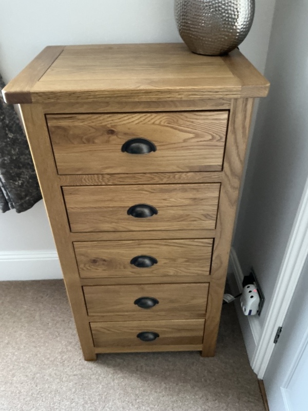 Oak Tallboy. Perfect condition, in a spare room. 5 draws. No longer needed. H100cm W53cm D40cm